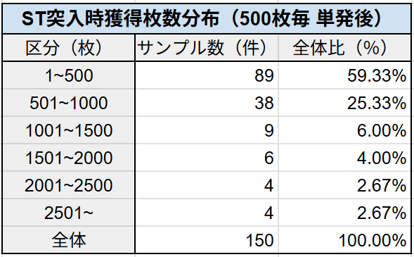 以下、単発(駆け抜け後)のST突入時における獲得枚数平均値・中央値・枚数分布です。