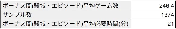 データ上のボーナス間(駿城ボーナス・エピソードボーナス不問)の平均当選ゲーム数は246.4G、平均所要時間は21分程度となっています。