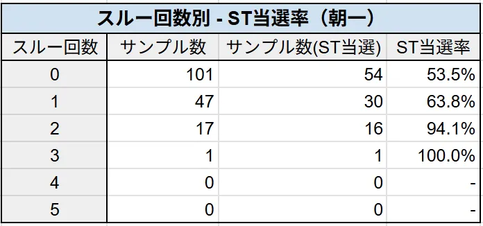 - 「朝一」時と比較すると2スルー時のST当選率が低下している
