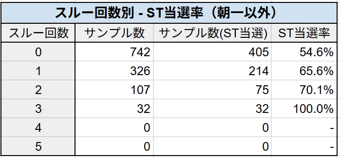 - 0スルーと1スルーを比較すると1スルーの方がST当選率が上昇している。