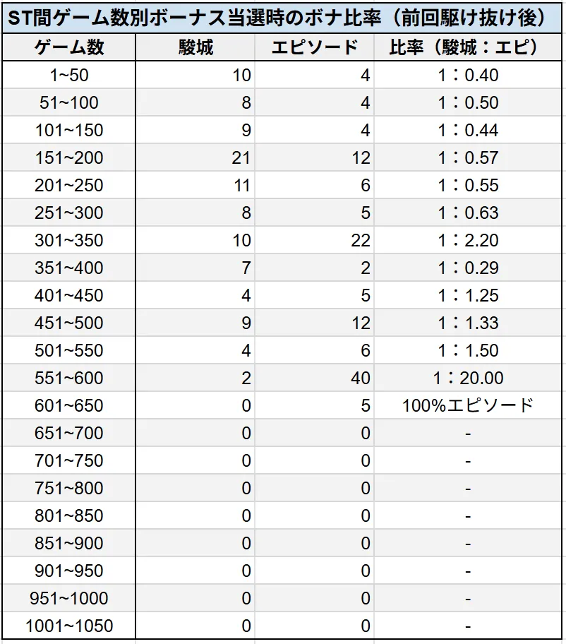 また、ボーナス当選時の比率(駿城ボーナスorエピソードボーナス)にも興味深いデータが出てきました。